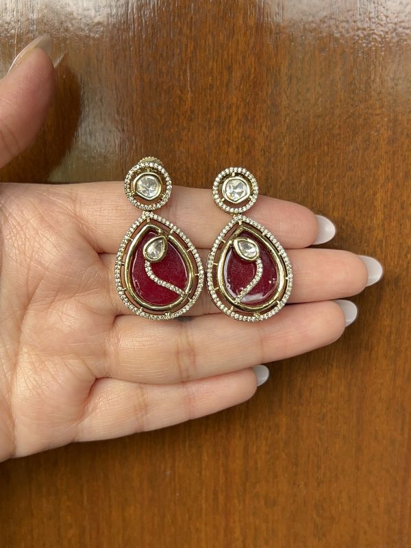 A refined blend of sophistication and traditional artistry, these teardrop-shaped earrings feature a rich ruby enamel center framed with sparkling Kundan stones. The sleek teardrop silhouette is enhanced with a delicate leaf-shaped Kundan detail, adding an elegant and modern ethnic touch.