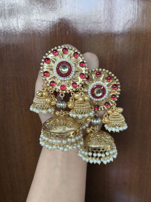 Beautiful three-layer red jhumki designed with a traditional touch. Lightweight, stylish, and perfect for festive outfits. Its bold red color and layered design add instant elegance to any look.